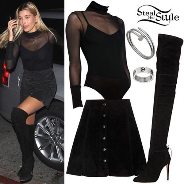 Hailey Baldwin kết hợp bodysuit cùng áo voan mỏng bên ngoài và