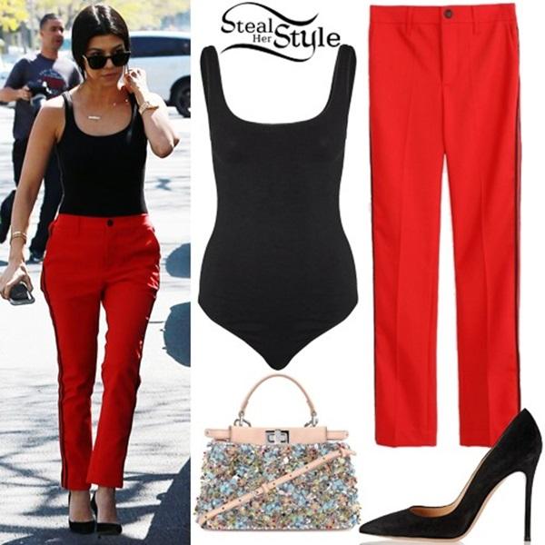Cách diện bodysuit như tank top của Kourtney Kardashian. Chiếc quần đỏ