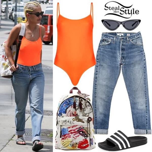 Bộ bodysuit cam nổi bật rất phù hợp với mái tóc tết vàng của Rita Ora.