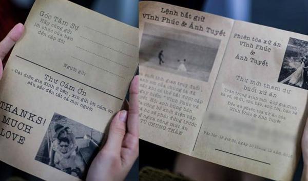 Theo đó, mặt trong tấm thiệp ghi rõ ngày giờ tổ chức lễ cưới, thông tin gia đình, mặt sau là sơ đồ hướng dẫn đường đi. Dòng chữ "Thiệp cưới" thường thấy được thay thế bằng "Lệnh bắt giữ" với 2 "bị cáo" cô dâu, chú rể.