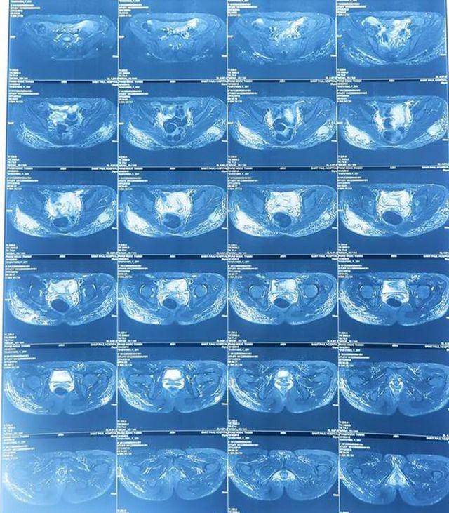 Tại BV E cũng từng tiếp nhận bệnh nhân nhiễm trùng, sưng, tấy đỏ ở mông. Qua kết quả khám, chụp cộng hưởng từ, các bác sĩ thấy 2 khối dịch lớn có tính chất trong suốt, kèm theo rất nhiều hạt nhỏ rải rác khắp 2 bên mông bệnh nhân.