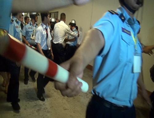 Bảo vệ dàn hàng ngang, dùng dùi cui ngăn cản đám đông.