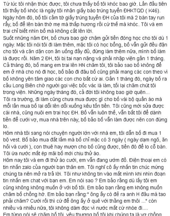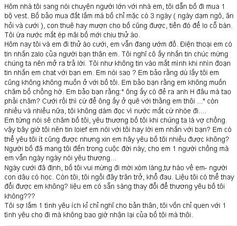 Em từng nói sẽ chăm bố tôi, yêu thương bố tôi khi chúng ta là vợ chồng. vậy bây giờ tôi nên tin lời em nói với tôi hay lời em nhắn với bạn? Em có thể yêu tôi ít cũng được nhưng xin em hãy yêu bố tôi nhiều được không? Người bố đã mang tôi đến trong cuộc đời này, cho em 1 người chồng mà em vẫn ngày ngày nói yêu thương".