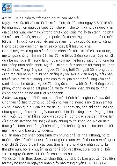Tâm sự trăn trở của một chàng trai về chữ hiếu, chữ tình, về việc phải đối mặt và giải quyết ra sao với vợ sắp cưới và người bố không chung huyết thống nhưng yêu thương mình như con đẻ đang nhận được rất nhiều quan tâm của cộng đồng mạng.