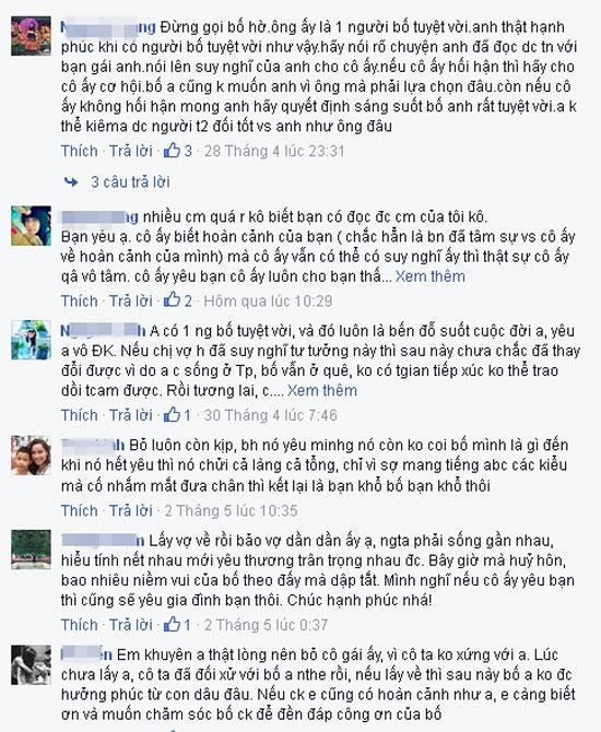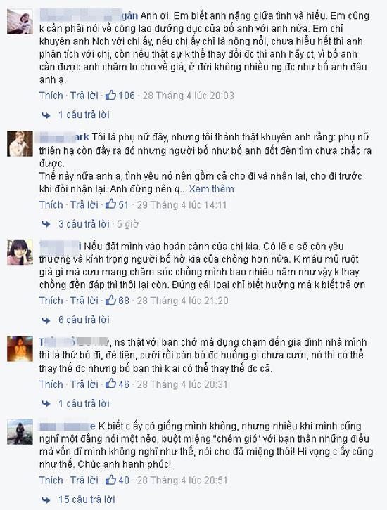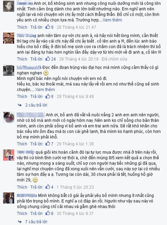"Một người bố tuyệt vời. Mong rằng chị kia sẽ nhận ra sai lầm của mình và yêu thương bố anh hơn. Nhưng dù gì thì anh cũng phải nhớ: không bao giờ vì bất cứ một lý do nào mà bất hiếu với bố. Cố lên anh. Em tin chị ấy sẽ thay đổi cách nghĩ của mình".