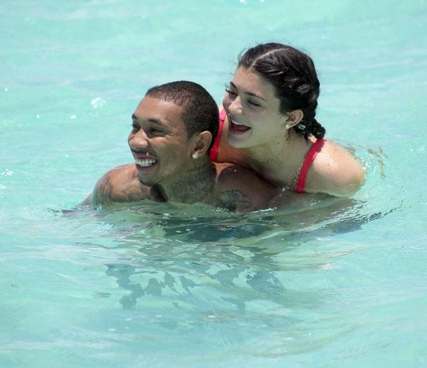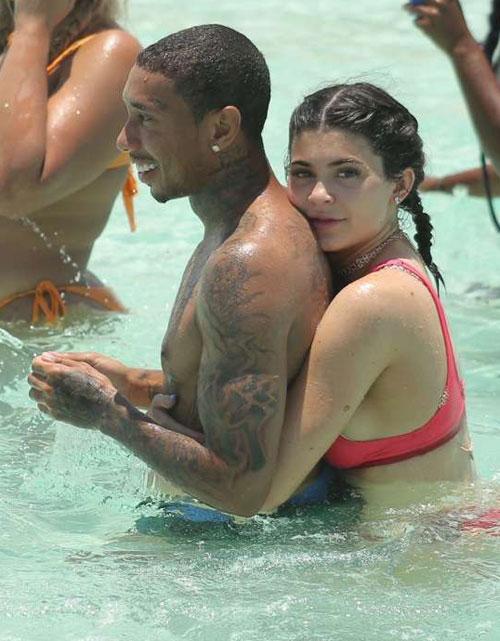 Kylie ôm chặt bạn trai và hôn lên lưng anh dịu dàng trong khi đi tắm biển Caribbe
