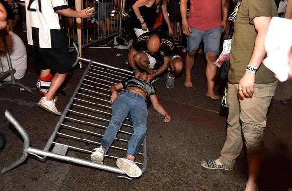 Trong hình, người hâm mộ đang sơ cứu cho một nạn nhân bất tỉnh. Hiện tại, không rõ nguyên nhân vụ nổ là gì, song báo chí cho biết đó có thể do pháo hoa.