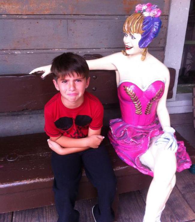 Được ngồi cạnh "người đẹp" còn khóc gì vậy nhóc.