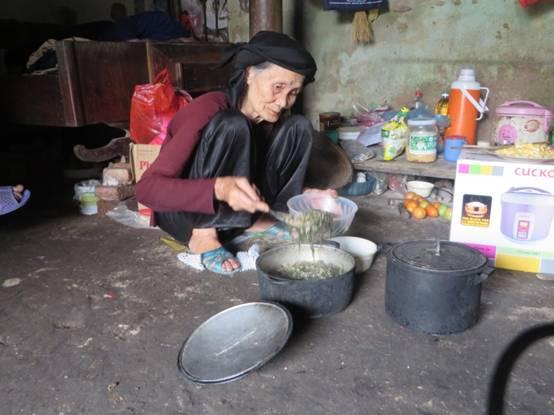 Trưa hôm ấy, chúng tôi từ UBND xã Quang Tiến trở về giúp cụ nấu cơm cũng như tìm hiểu thêm về cuộc sống của cụ. Lúc này cụ đang hì hục dưới bếp nấu cho các con nồi cháo rau ngải để ăn rồi uống thuốc. Tôi ngượng hỏi tuổi tác bà cụ đã cao, vậy bà lấy đâu ra tiền để hàng ngày chăm nuôi con cái đang bệnh. Bà nói: “Trợ cấp cho người tàn tật của chúng nó mới có được 2 năm nay, mỗi đứa được 500.000đ, còn đâu tôi vẫn đi câu cá để bán lấy tiền mua gạo cho chúng nó”. Hai mắt bà đỏ ngầu như chỉ chực khóc, đến khi chúng tôi trở về hình ảnh bây giờ đây vẫn còn đọng lại trong tâm trí tôi.