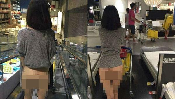 người ngỡ ngàng khi một cô gái trẻ không thèm mặc quần, thản nhiên đi dạo trong cửa hàng.