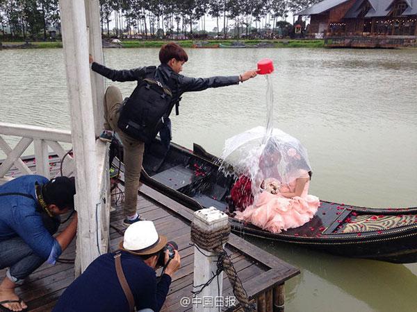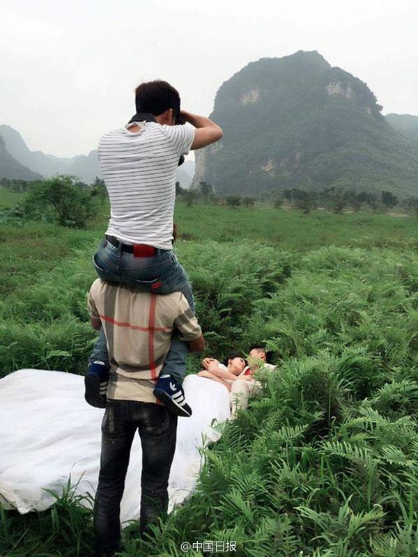 Làm nên những bức ảnh cưới ghi dấu khoảnh khắc đẹp nhất đời người, không thể không kể đến công sức của các nhiếp ảnh gia tận tụy. Lội bùn, treo lủng lẳng trên dây, trèo cây, lăn lê bò toài... không gì có thể ngăn cản được các tay máy sáng tạo các bức ảnh đẹp.