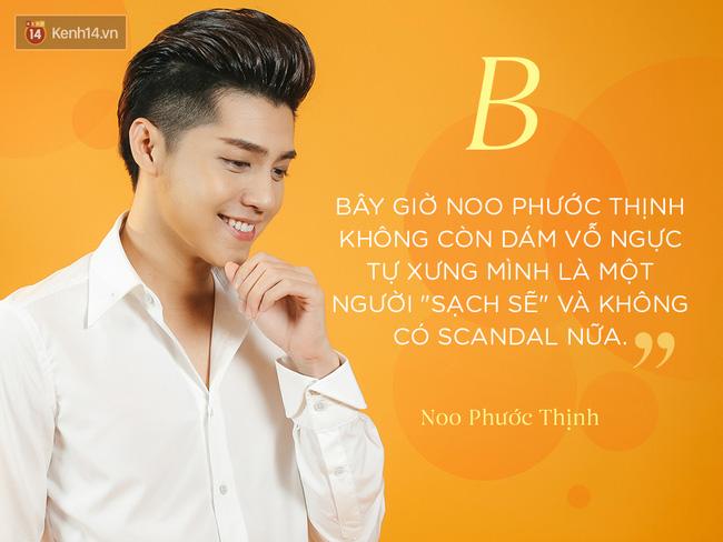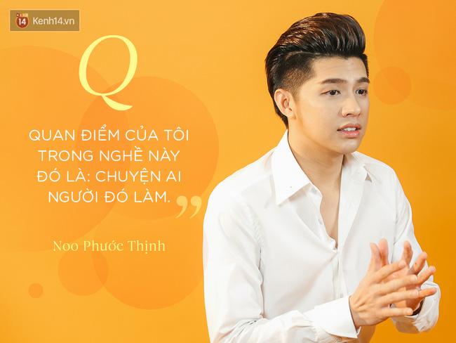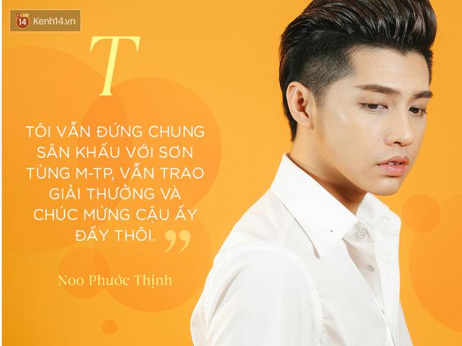 Việc nhận được những thành tựu trong năm qua cũng là lúc tôi phải đối mặt càng nhiều sóng gió hơn. Bây giờ Noo Phước Thịnh không còn dám vỗ ngực tự xưng mình là một người "sạch sẽ" và không có scandal nữa, mặc dù mình không làm gì cả. Tôi nghĩ điều đó cũng khá thú vị, vì cuộc sống luôn có những điều mình không bao giờ tưởng tượng trước được. Tôi chọn đối diện tất cả những điều đó bằng nụ cười của mình, chứ giải thích thì không biết đến bao giờ và liệu có được chấp nhận hay không. Nhưng Noo vẫn phải là Noo thôi, vẫn phải sống, phải hát, phải cống hiến, chứ không thể vì ý kiến tiêu cực của người khác mà thay đổi chính bản thân.