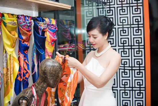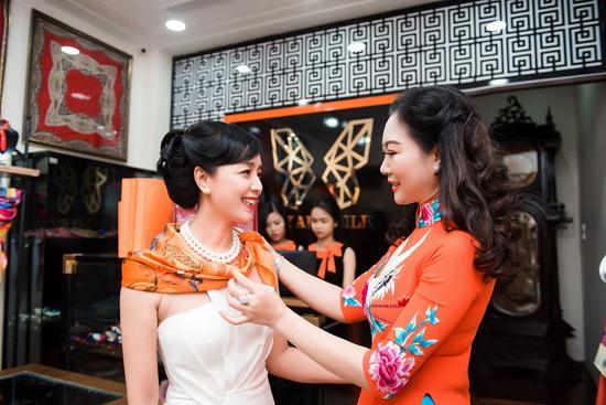 NSƯT Chiều Xuân được chính Doanh nhân Kim Cương hướng dẫn cách kết hợp chiếc khăn lụa tơ tằm cao cấp được dệt bằng vàng 18K