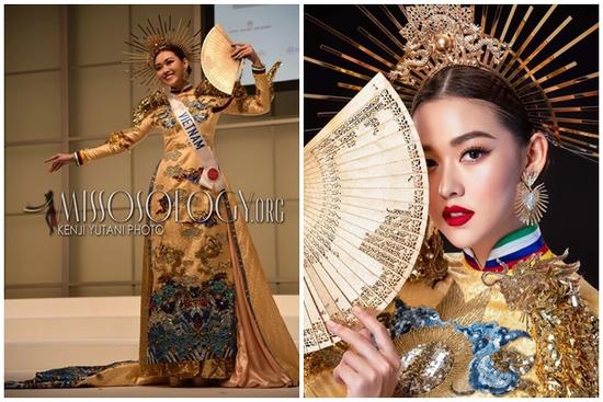 Sau khi phân vân giữa 2 bộ áo dài hoành tráng thì "Rồng chầu mặt trời" đã được á hậu Nguyễn Tường San và ê-kíp chọn để mặc trong buổi ra mắt báo chí của Miss International 2019.
