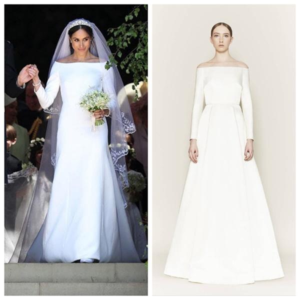 Mẫu váy cưới cô dâu Meghan Markle diện (ảnh trái) và thiết kế của nhà mốt Emilia Wickstead.