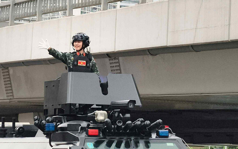 Trong đó, hình ảnh nữ chiến sĩ đứng trên xe bọc thép Shinjeong S5 khiến nhiều người yêu thích. Cô thực hiện động tác chào điều lệnh khi diễu qua lễ đài và tươi cười vẫy chào người dân hai bên đường.