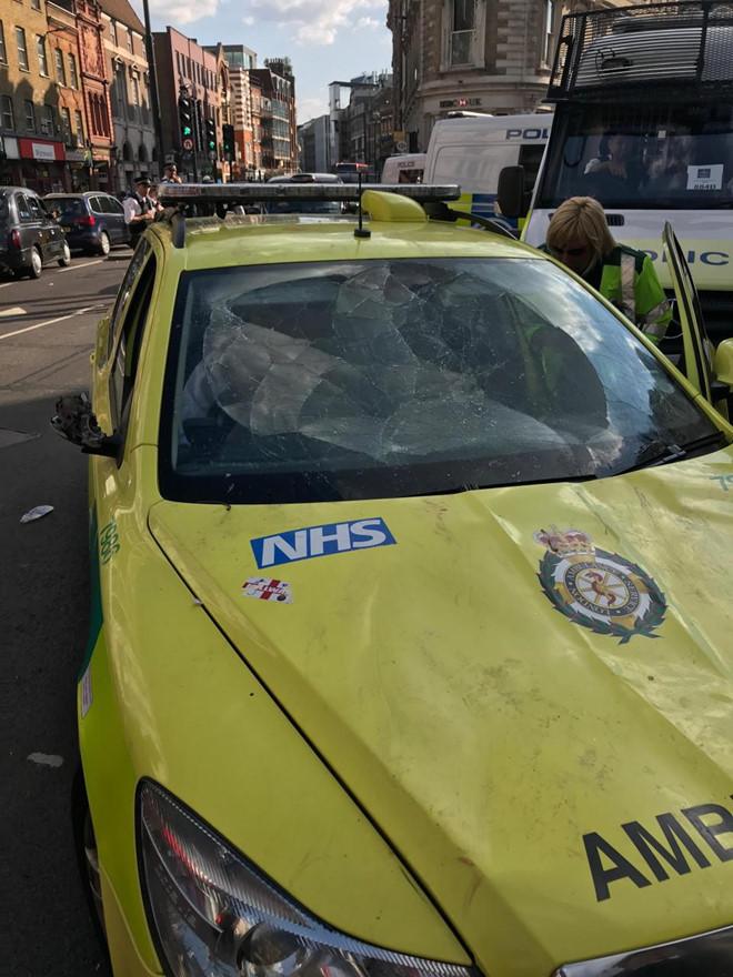 Chiếc xe cứu thương méo mó sau màn ăn mừng của cổ động viên Anh.