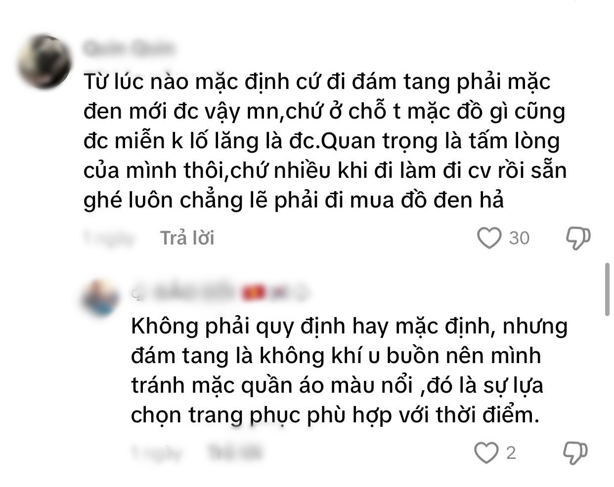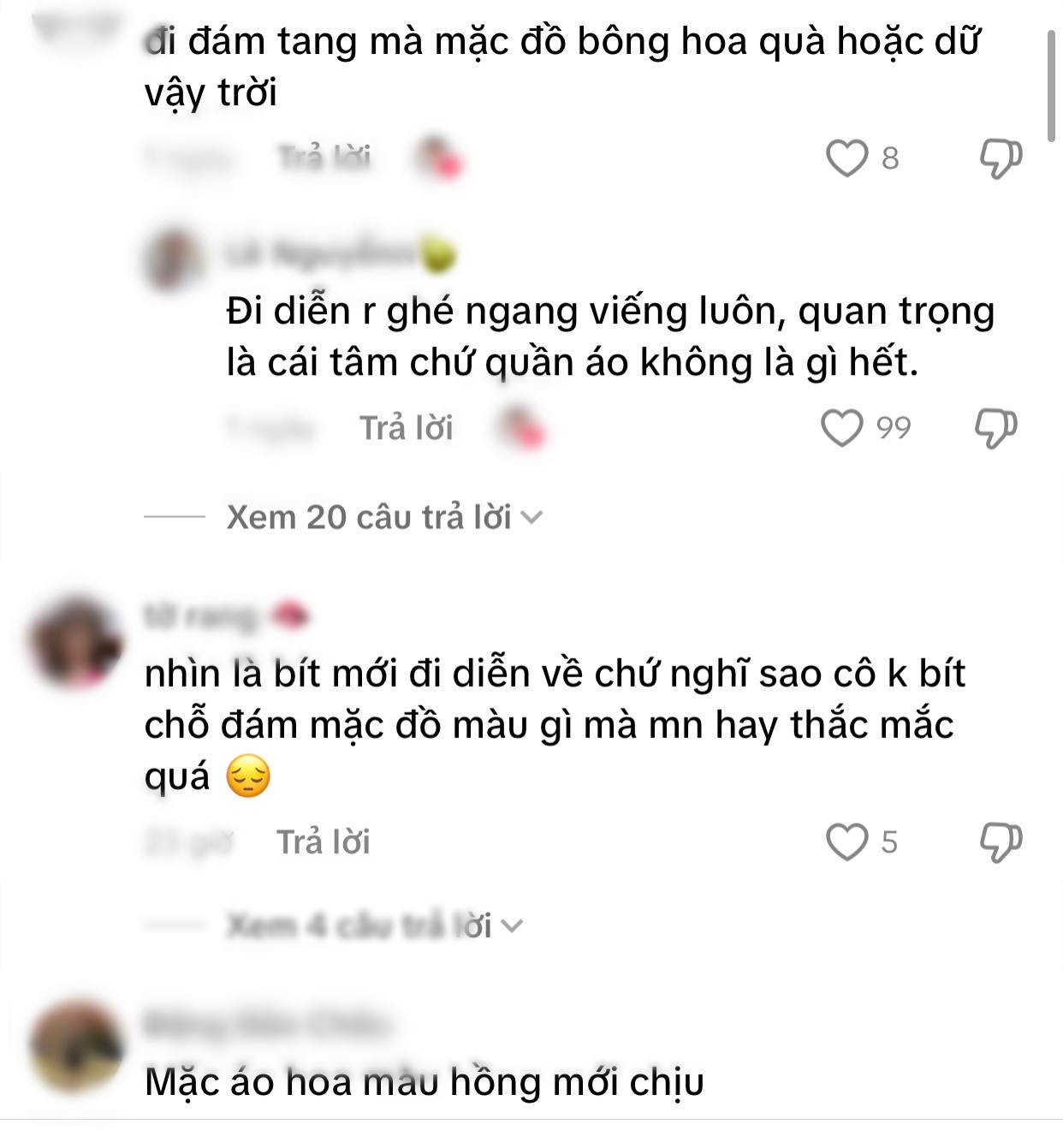 Ý kiến trái chiều nổ ra, phần đông cho rằng nữ diễn viên diện trang phục không phù hợp khi đến một tang lễ. "Đám tang là không khí u buồn nên tránh mặc đồ màu nổi, đó là sự lựa chọn trang phục phù hợp với thời điểm", một netizen bình luận. Cũng có người cho rằng, có thể thể nữ diễn viên vừa diễn nên không kịp thay trang phục.