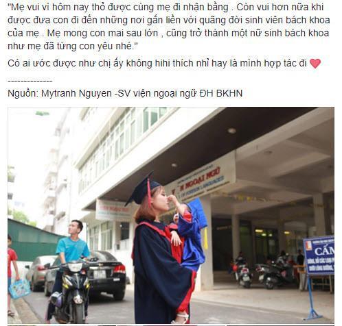 Xuất hiện trên hàng loạt fanpage Việt lớn gần đây, loạt ảnh một nữ sinh viên Bách Khoa trong bộ đồ cử nhân đang âu yếm cô con gái nhỏ thu hút sự quan tâm mạnh mẽ. Dòng tiêu đề được cho là của chính người mẹ viết như sau: