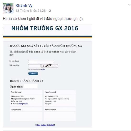 Nữ sinh bắn 7 thứ tiếng, niềm tự hào của Nghệ An - Khánh Vy - mới đây đã hạnh phúc "khoe" trên trang cá nhân kết quả trúng tuyển Đại Học của mình. Với số điểm thi xuất sắc là 25,53 (trong đó Toán 7,5; Văn 8,75; tiếng Anh 9,28), cô nàng đã đỗ 1 lúc 2 trường Đại Học: khoa Kinh Tế đối ngoại của ĐH Ngoại Thương (điểm chuẩn 24,95) và khoa Quan hệ Quốc Tế Học viện Ngoại giao (điểm chuẩn 24,5)