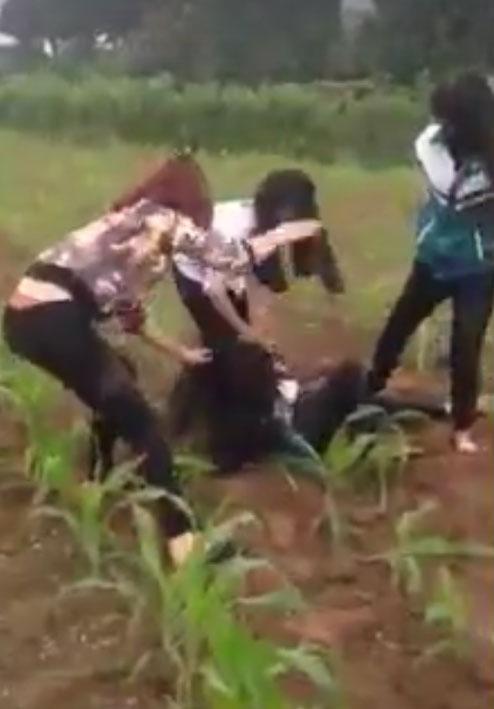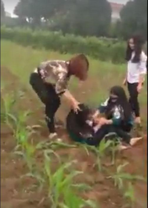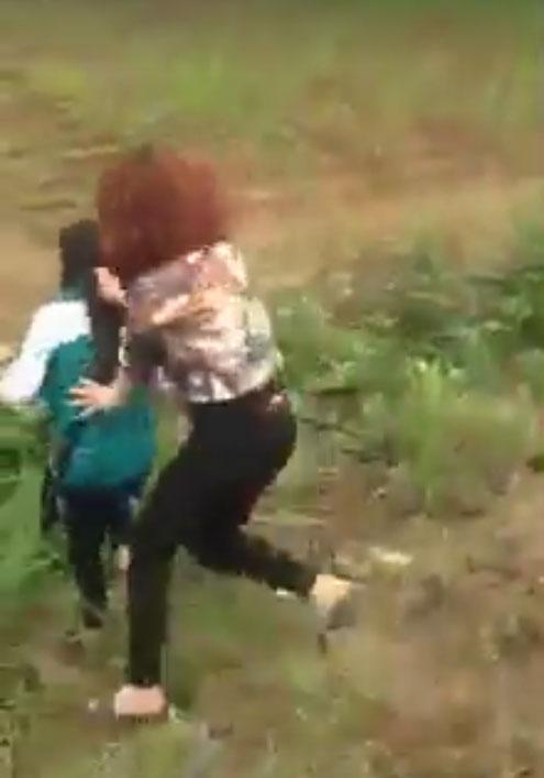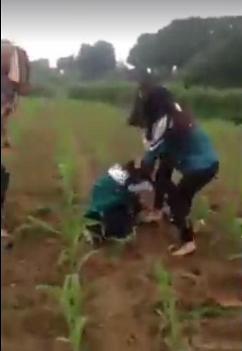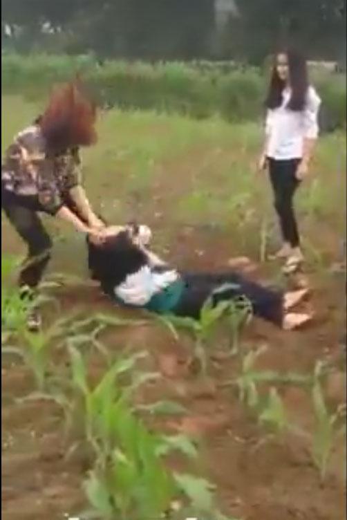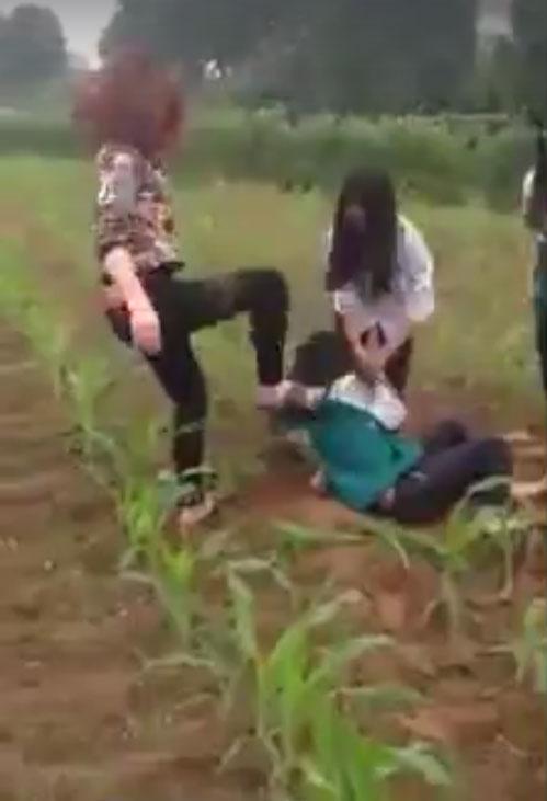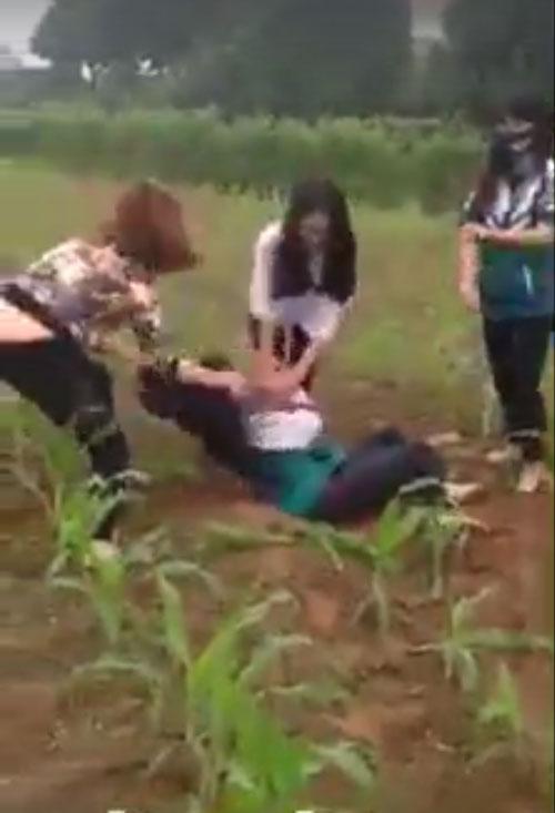 Nữ sinh còn mặt áo đồng phục bị một cô gái mặc áo hoa đuổi xuống ruộng ngô để đánh đập.