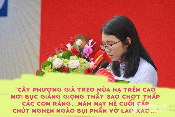 Thanh Tú đọc bài viết chia tay mái trường khiến nhiều bạn bè bên dưới xúc động, bất khóc. Ảnh: Báo Nghệ An.