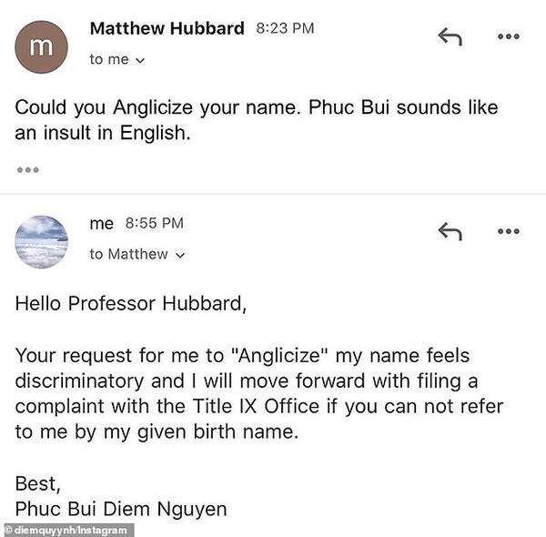 Phúc Bùi cho rằng yêu cầu của giáo sư Hubbard có tính "phân biệt đối xử", đồng thời cho biết sẽ gửi đơn khiếu nếu thầy không gọi cô bằng tên khai sinh.