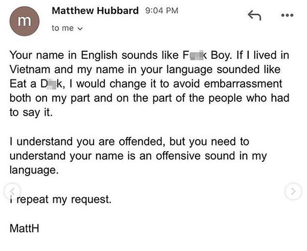 Giáo sư Matthew Hubbard gửi mail yêu cầu Phúc Bùi "Anh hóa" tên mình.