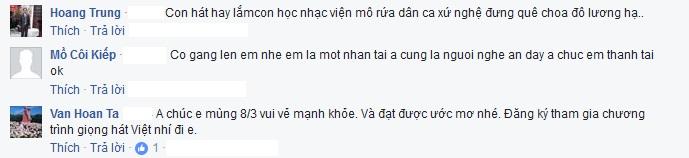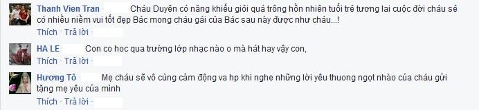 "Cố gắng lên em nhé, em là một nhân tài...", "Cháu Duyên có năng khiếu giỏi quá, trông hồn nhiên, tuổi trẻ tương lai cuộc đời cháu sẽ có nhiều niềm vui tốt đẹp. Bác mong cháu gái của bác sau này được như cháu...!", "Mẹ cháu sẽ vô cùng cảm động và hạnh phúc khi nghe những lời yêu thương, ngọt ngào này" - đó là một trong số bình luận của cư dân mạng dành cho Duyên.