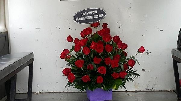 Lẵng hoa người vợ gửi tặng người chồng đã khuất. (Ảnh: Zing)