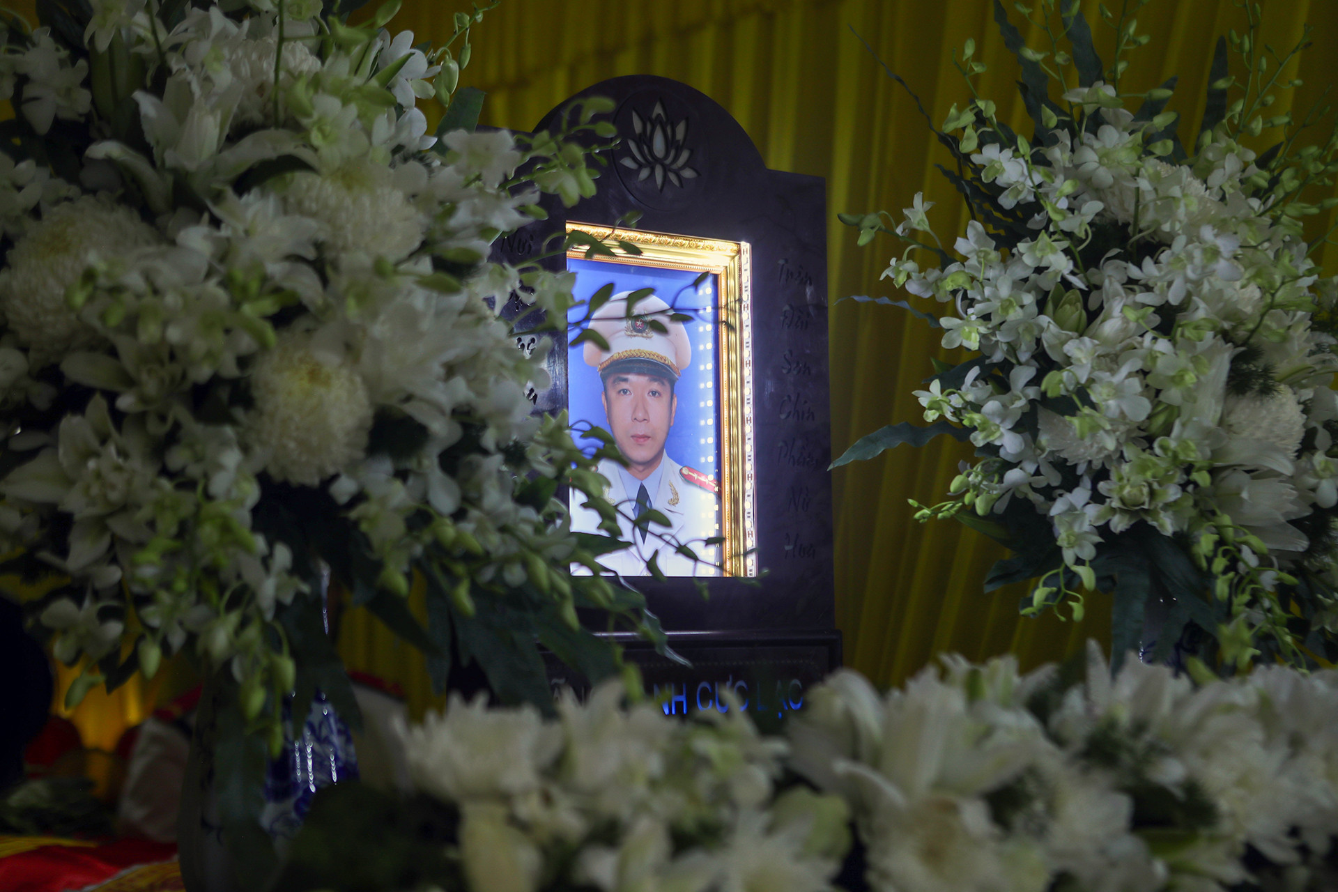 Bên linh cữu, chị Lê Thị Thùy Hân, vợ Thiếu tá Hải, ôm chặt đứa con thơ, thỉnh thoảng đưa tay chạm vào di ảnh chồng, nấc nghẹn trong tiếng khóc. Đến lúc này, chị vẫn chưa thể chấp nhận sự thật rằng “chồng mình đã ra đi”.