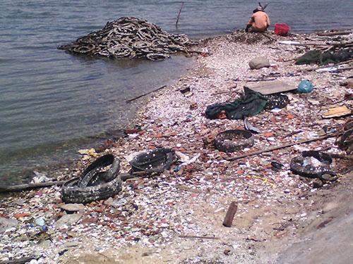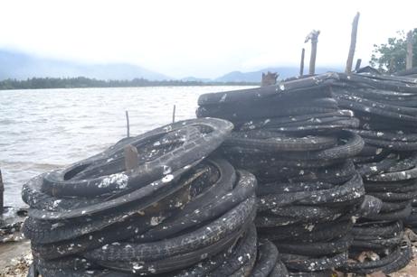Lốp xe cũ và vỏ hàu tràn ngập vịnh Lăng Cô trong thời gian thu hoạch hàu.
