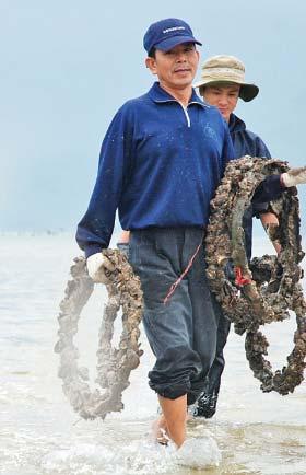 Một người dân nuôi hàu tại thị trấn Lăng Cô, huyện Phú Lộc, Thừa Thiên - Huế cho biết: “Hàu được nuôi từ tháng 3 đến khoảng thám 12 lấy lên, chẻ ra và bán. Mỗi năm bỏ khoảng 300-400.000 lốp xe được ngâm xuống vịnh Lăng Cô…”