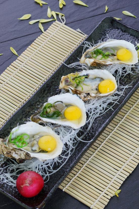 Hàu sống kiểu Kisu với rong biển và lòng đỏ trứng cút
