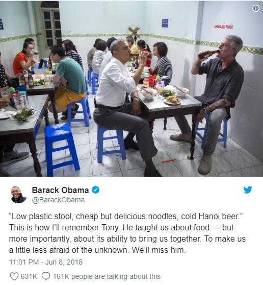 Trong thông điệp đăng tải trên Twitter ngày 8/6, Obama chia sẻ bức ảnh ngồi ăn bún chả và cách ông sẽ nhớ mãi về Bourdain.