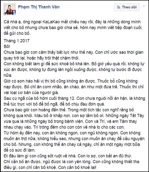 "Bố đi chơi một vòng cho mát đi bố. Con vẫn tiếp tục sống tốt, sống thật tốt, lo cho gia đình và các cháu của bố! Bố cứ yên tâm, có con đây! Có gia đình, có mọi người đông đủ bố ạ. Hãy về gặp con trong giấc mơ bố nhé! Con thương và nhớ bố", Ốc Thanh Vân trải lòng.