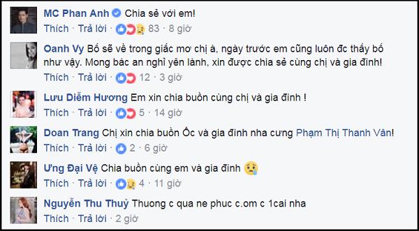 Bức tâm thư Ốc Thanh Vân gửi người bố mới qua đời đã "chạm đến trái tim" của nhiều khán giả. Nhiều sao Việt như ca sĩ Đoan Trang, Vy Oanh, Ưng Đại Vệ, MC Phan Anh, hoa hậu Diễm Hương... cùng đông đảo bạn bè, người hâm mộ đã gửi lời chia buồn đến Ốc Thanh Vân và mong cô sớm vượt qua nỗi đau này.