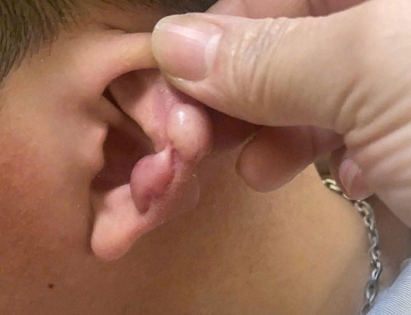 Nhưng may mắn chưa thấy đâu, chỉ chưa đầy 1 tuần, 2 dái tai anh L. xuất hiện những cục lồi lõm, vô cùng đau đớn.