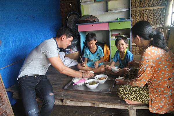 Trong số 300 hộ gia đình khó khăn tại xã Nguyễn Phích, huyện U Minh, Cà Mau, Bình Minh và BTC đã đến trực tiếp thăm gia đình chị Dương Diễm My. Ngoài phần quà của chương trình Góp Tình Trao Tết, Bình Minh cũng tặng thêm 3 triệu đồng, gạo, quạt máy và cả dép mới cho 3 mẹ con.