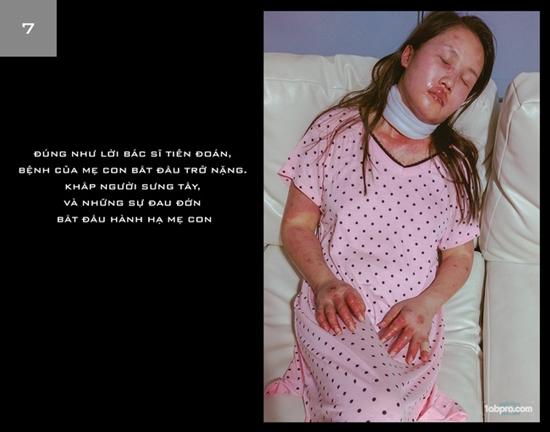 Căn bệnh Lupus đã làm sức khỏe của chị Huyên suy giảm khá nghiêm trọng, tay chân chị bắt đầu xuất hiện nhưng vết nứt nẻ, tóc rụng đi, đặc biệt là căn bệnh có nguy cơ lan sâu vào các bộ phận khác trong cơ thể gây nguy hiểm cho chị. Thế nhưng dù phải chịu rất nhiều đau đớn, chị Huyên vẫn chịu đựng và gắng gượng. "Cứ mỗi đêm đến là một cực hình, những vết thương rạn nứt và chảy máu nhiều. Nó làm mẹ con đau đớn đến mức không ngủ được. Thế nhưng mẹ con lúc nào cũng cười vì không muốn làm ba lo lắng", người chồng chia sẻ trong nước mắt.