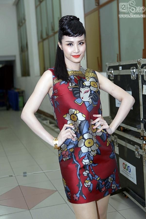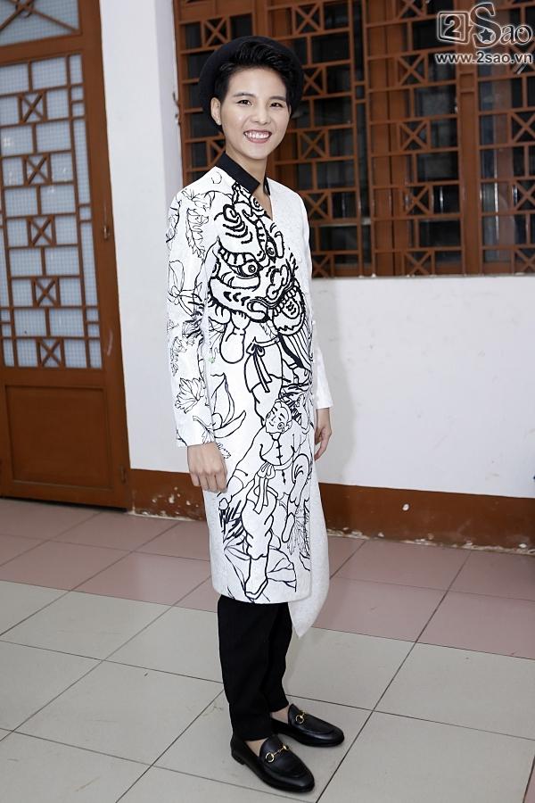 Vũ Cát Tường với trang phục áo dài cách tân với họa tiết dân gian