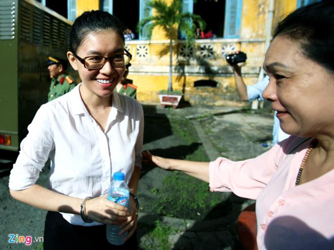 Khi vừa bước xuống xe thùng, mẹ bị cáo Trương Hồ Phương Nga đã lại gần động viên Dung. Ảnh: Hải An.