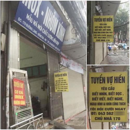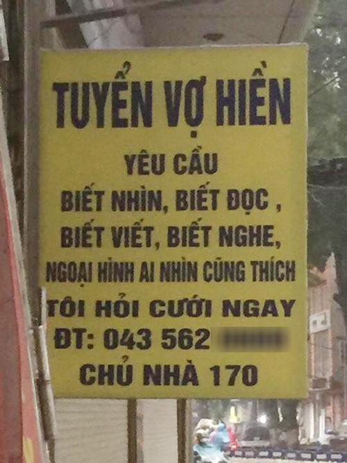 Mới đây nhất trên một diễn đàn mạng xuất hiện hình ảnh tấm bảng tuyển vợ nhận được nhiều quan tâm và phản hồi của dư luận. Nội dung của tấm biển là: "Tuyển vợ hiền, yêu cầu biết đọc, biết viết, biết nghe. Ngoại hình ai nhìn cũng thích. Tôi cưới hỏi ngay". Kèm theo đó là số điện thoại và địa chỉ nhà.