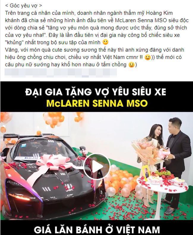 Trên trang cá nhân, anh dành tặng vợ những câu nói ngọt ngào: "Tặng vợ yêu món quà mong được ước thấy, đúng sở thích của vợ yêu nhé. Chiếc siêu xe McLaren Senna mang biển số MAILISA, tên của người phụ nữ mà anh yêu.