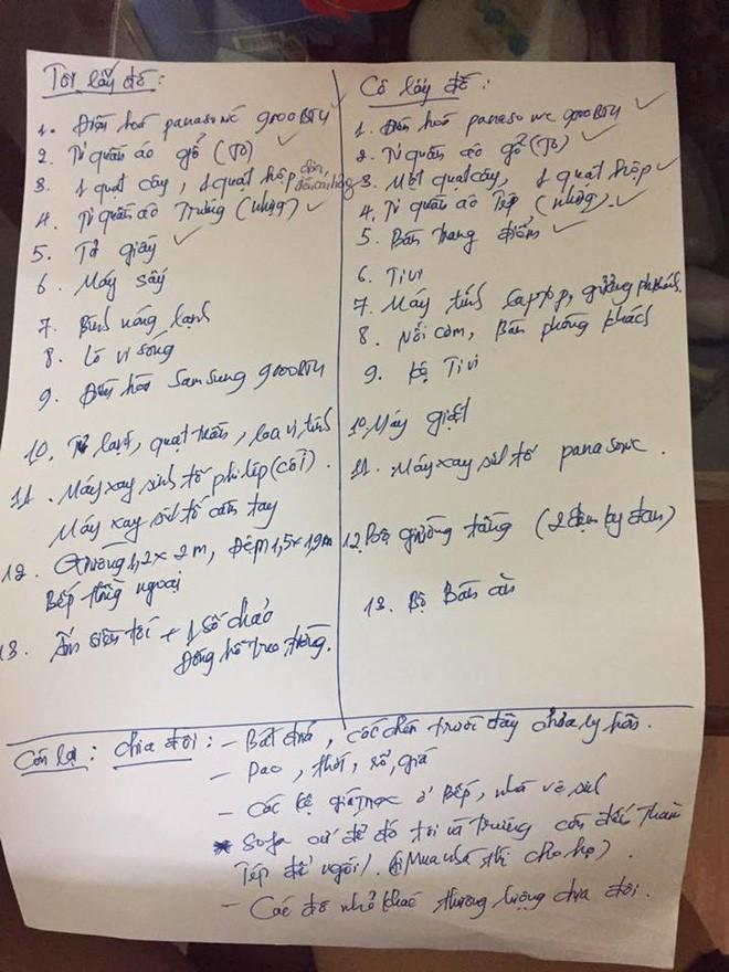 Bản kê khai chi tiết chia đôi tài sản sau ly hôn do tự tay người chồng viết. Ảnh: FBNV.
