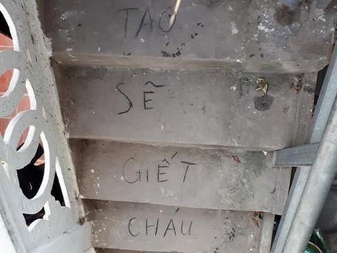 Tại hiện trường nghi phạm đã để lại dòng chữ “tao sẽ giết cháu mày Lăng” trên bậc cầu thang lên tầng hai của ngôi nhà.
