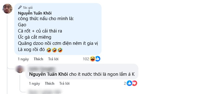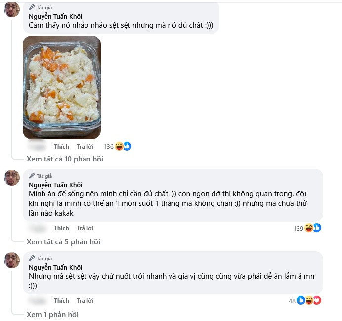 Nhiếp ảnh gia Tuấn Khôi còn để lại công thức nấu món ăn nhanh tiện lợi và theo anh là vẫn đầy đủ chất dinh dưỡng này. Ngay khi hình ảnh nhận nhiều ý kiến trái chiều, chồng Hen cũng bày tỏ quan điểm sống giản dị của bản thân: "Mình ăn để sống nên mình chỉ cần đủ chất, còn ngon dở thì không quan trọng, đôi khi nghĩ là mình có thể ăn một món suốt một tháng mà không chán, nhưng mà chưa thử lần nào".