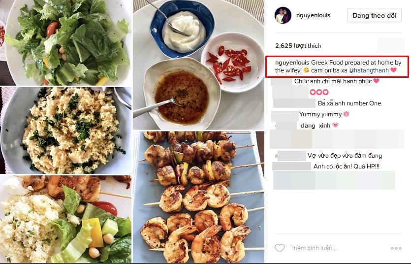 Hạnh phúc với những gì mình đang có, mới đây, ông xã Tăng Thanh Hà đã chia sẻ bữa ăn của gia đình với món ăn kiểu Hy Lạp do vợ trổ tài nấu nướng cùng lời cảm gửi tới "người đầu ấp má kề". Lời có cánh dành cho vợ của Louis Nguyễn: Greek Food prepared at home by the wifey! Cảm ơn bà xã Tăng Thanh Hà - (Tam dịch: Đồ ăn Hy Lạp bà xã làm ở nhà. Cảm ơn bà xã Tăng Thanh Hà).