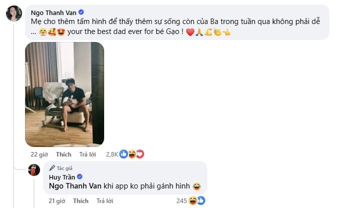 Dưới bài đăng hút hơn 100 nghìn lượt thích của Huy Trần, bà xã Ngô Thanh Vân còn thả nhẹ một bức hình nam doanh nhân đang ngồi bế bé Gạo kèm bình luận: "Mẹ cho thêm tấm hình để thấy thêm sự sống còn của Ba trong tuần qua không phải dễ… your the best dad ever for bé Gạo".