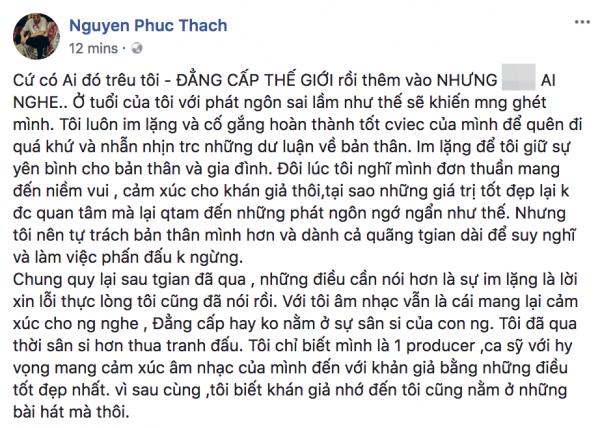 Anh viết đôi dòng tâm sự tự nhận rằng đó là một sai lầm của bản thân, nên cũng chọn phương án giữ im lặng nhẫn nhịn trước áp lực dư luận và chỉ biết cố gắng hoàn thành tốt công việc. Dù vậy, anh cũng khá buồn bã khi “giá trị tốt đẹp mà mình mang đến lại không được quan tâm, mà khán giả chỉ quan tâm đến những phát ngôn ngớ ngẩn như thế”. Chung quy lại, Only C đã gửi lời xin lỗi chân thành và hi vọng những cảm xúc tốt đẹp thông qua âm nhạc sẽ tiếp tục được truyền tải đến công chúng.